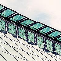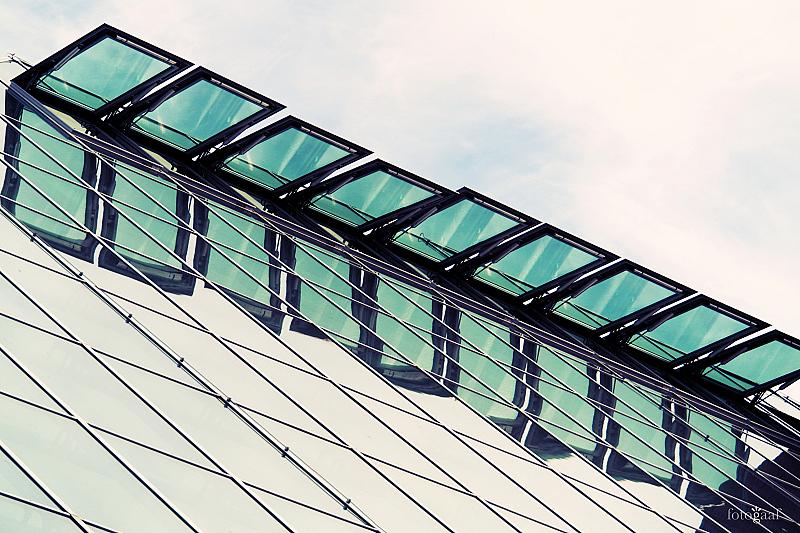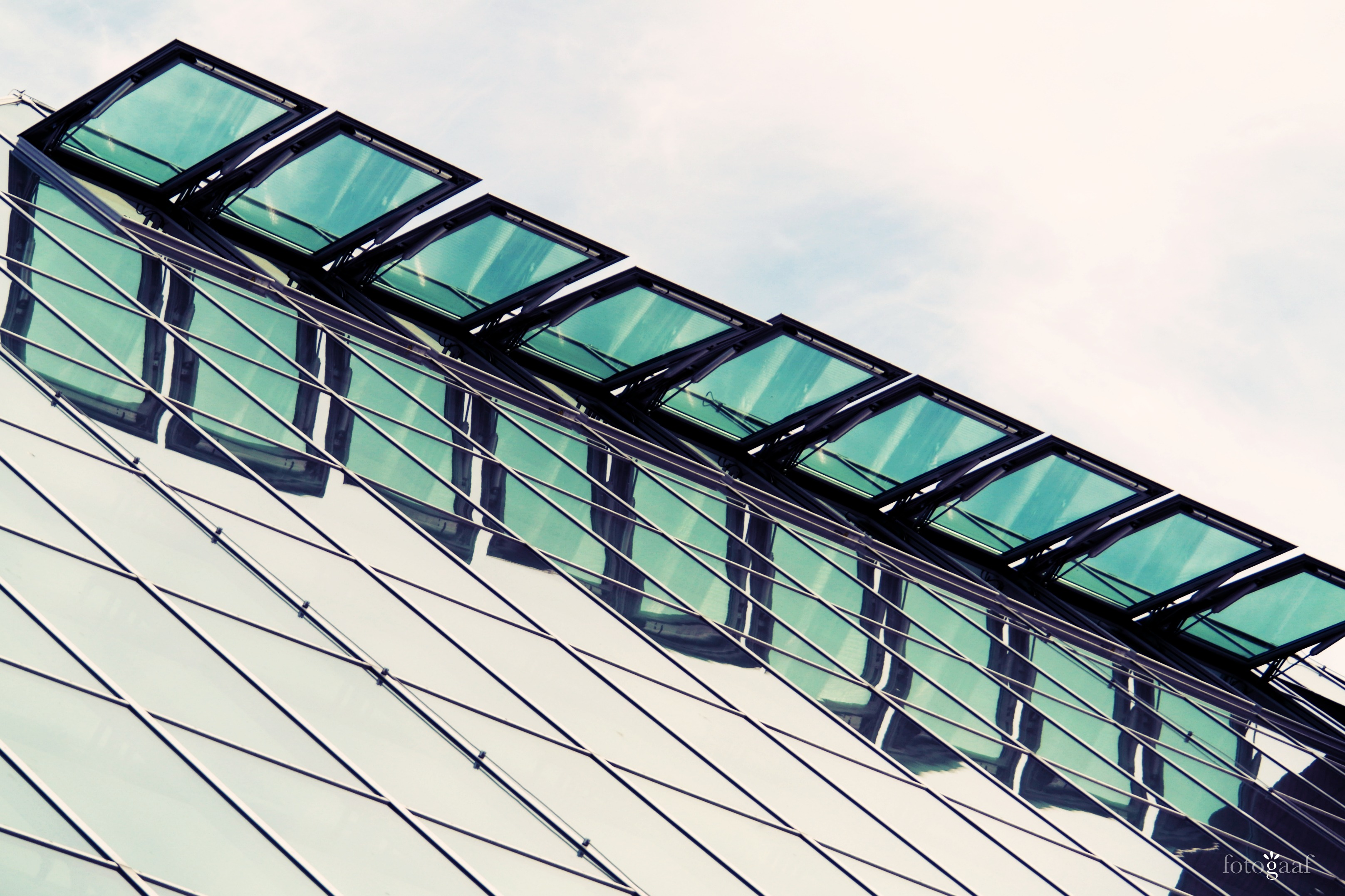 Een ramenpartij in de nok van de bibliotheek, prachtige reflectie.