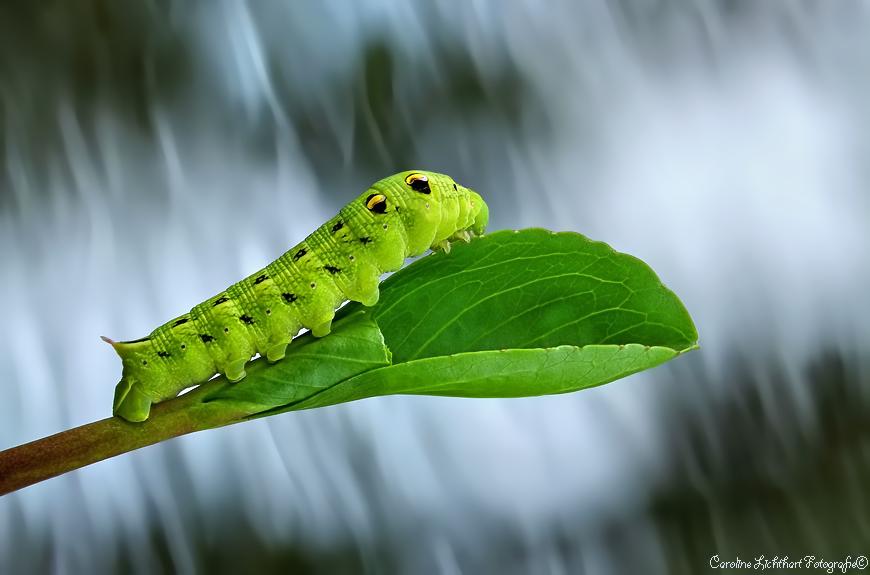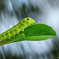 Een grote groene rups kijkt uit naar het voorjaar.. De achtergrond is een stromend beekje onder de rups.