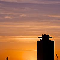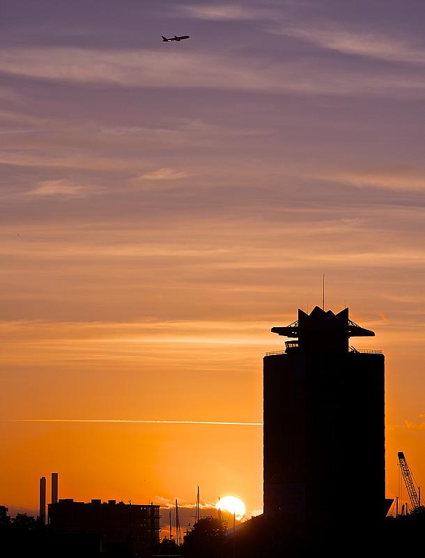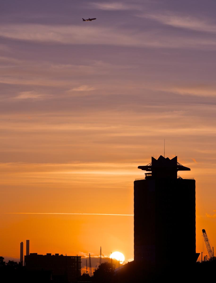 De oude shell toren met een vliegtuig die net is opgestegen vanaf Schiphol