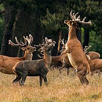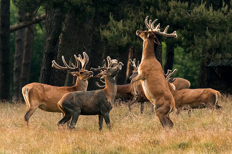Deze avond waren de herten heel onrustig. De geweien zijn hier nog niet geveegd en met hun bastgewei kunnen/willen ze niet vechten, dus dan maar lepelen (op de achterpoten staan en met de voorpoten zwaaien) om indruk te maken op de rest. Vooral de uitdrukking van de twee herten op de grond vind ik bijzonder.