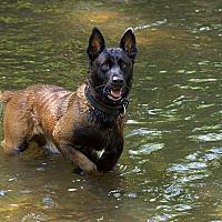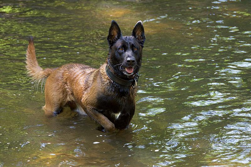 Turbo is een mechelse herder en is vaak in het water te vinden.