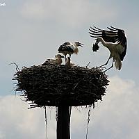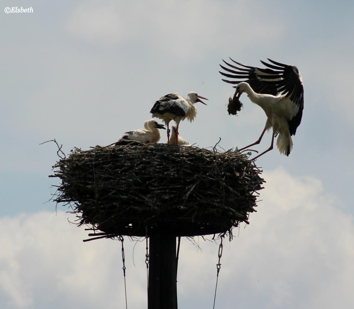 Actie van een ooievaar die net aan komt vliegen.