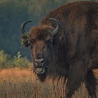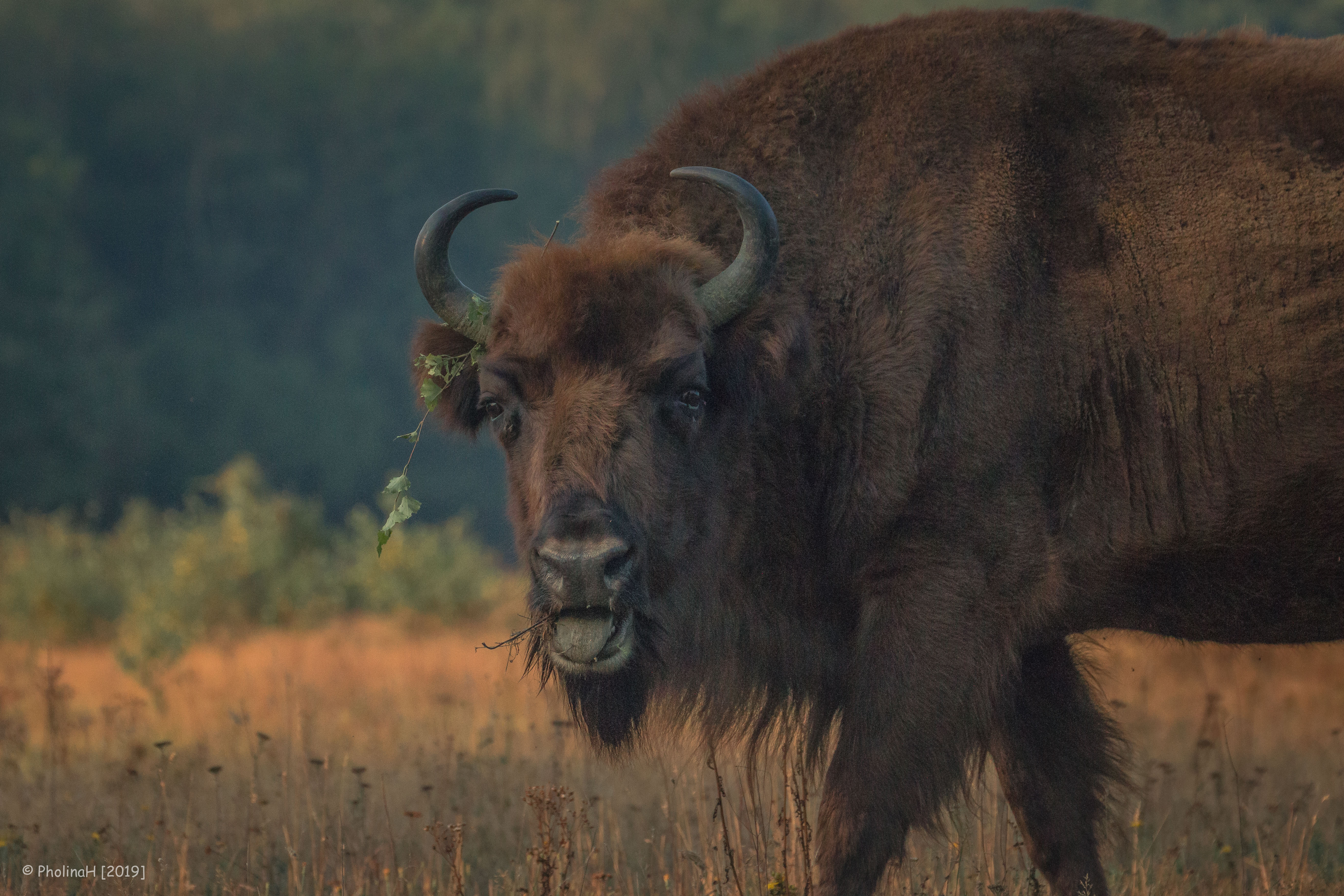 Wisent met decoratieve tak op zijn hoorns in natuurgebied de Maashorst
