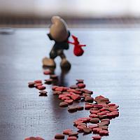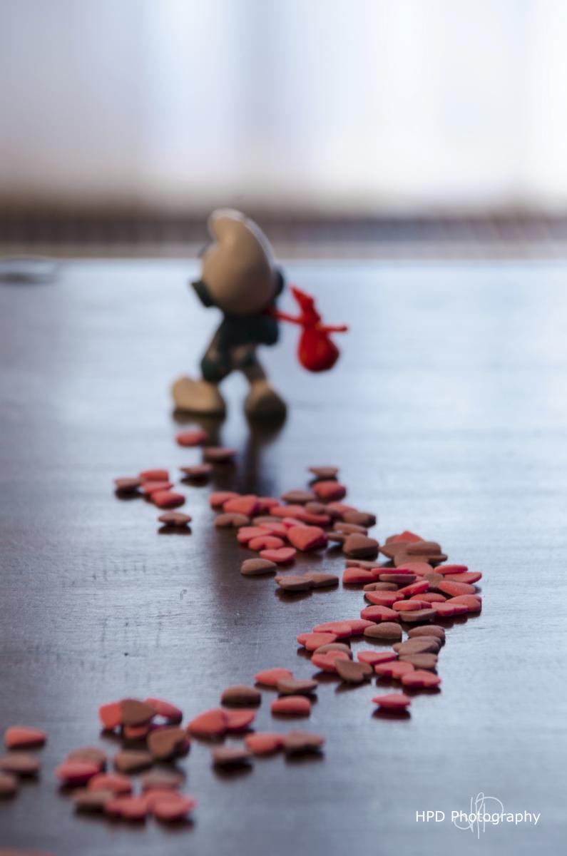 Weer eens iets totaal anders. In de '52 week challenge' die ik dit jaar wil voltooien, was het thema 'candy'. Tja, wat moet je daar mee.... Had nog een potje hartvormige versiersels staan, en zwerversmurf als figurant. Het was bijna valentijsdag toen ik de foto nam, en dat gaf wat inspiratie. Veel geleerd over focus en scherptediepte bij 'macro' fotografie.
