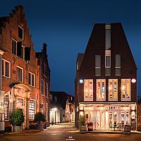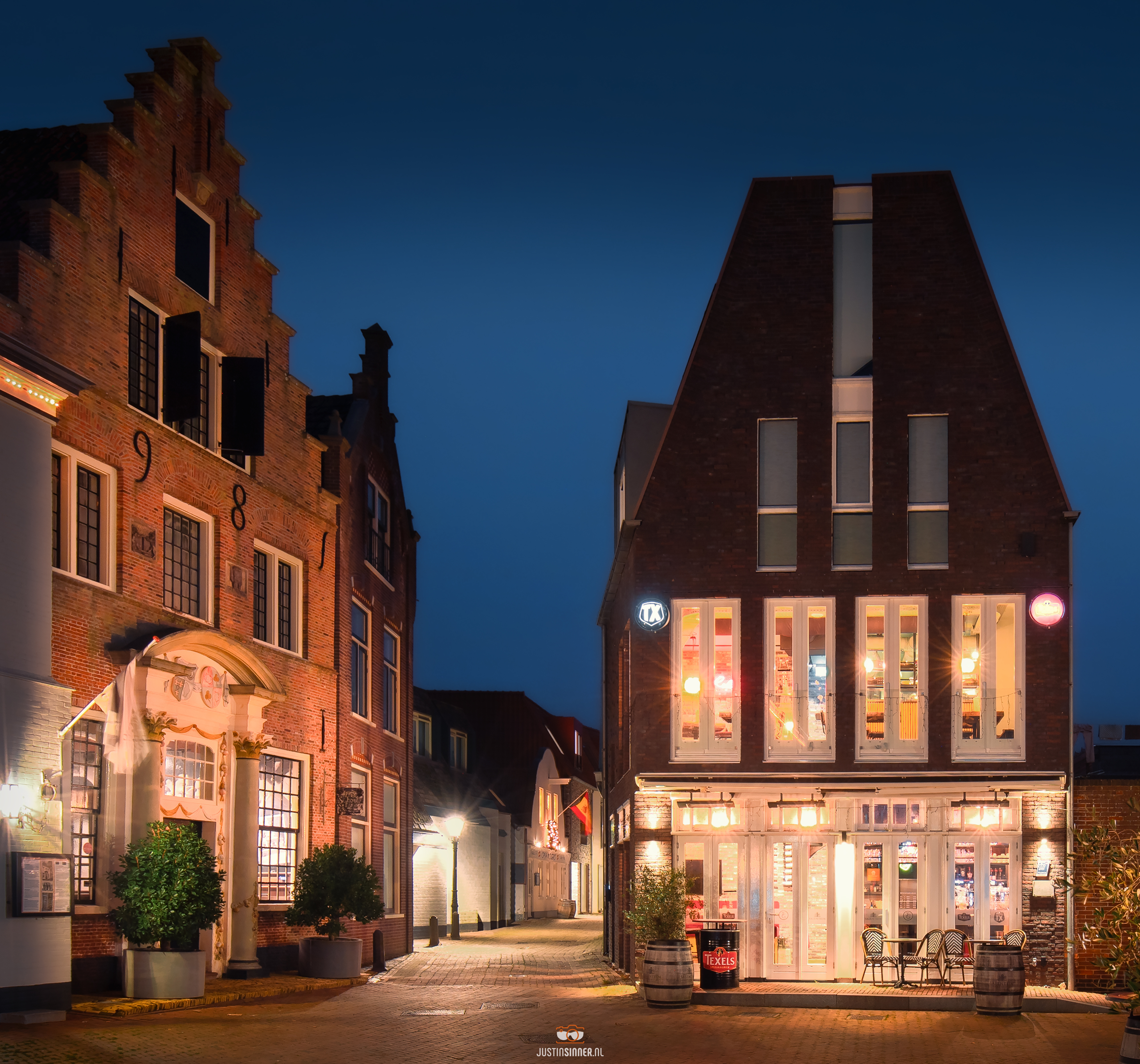 Oud en nieuw op Texel, links het Schoutenhuys voormalig gerechtsgebouw nu een sfeervol restaurant. En rechts een recent gebouw nu restaurant Texels Goud hier stond vroeger café De Karseboom. Sfeervolle foto van het centrum van Den Burg op Texel #Texel #justinsinner #denBurg #waddeneiland