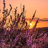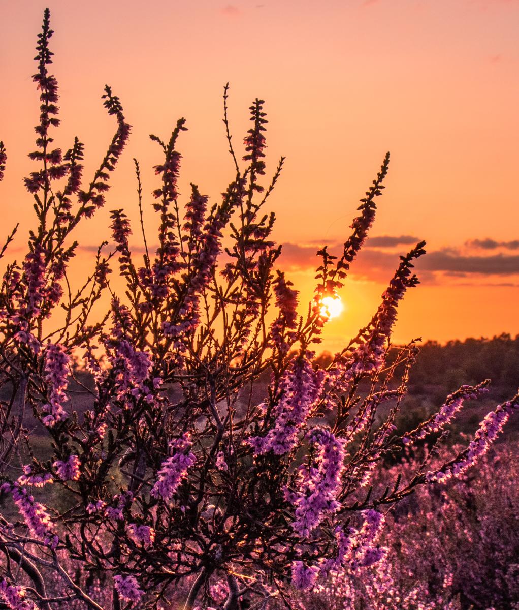 Paarse heide Posbank tijdens zonsondergang.
