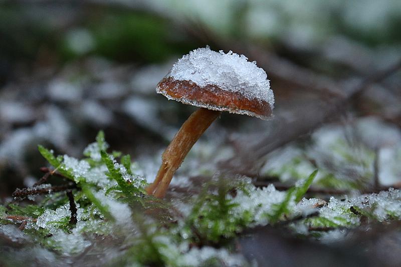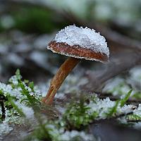 De eerste sneeuw van dit jaar( 2014) smolt en bevroor op deze paddenstoel, die lijkt te bezwijken onder het gewicht.