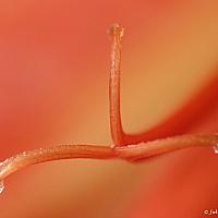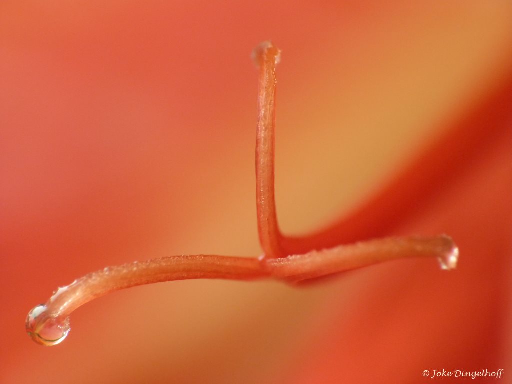 Stamper met nectardruppel tegen de warm oranje kelkbladeren van de Alstroemeria.