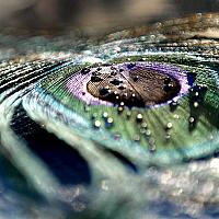 Een glimmende pauwenveer in het late avondlicht