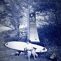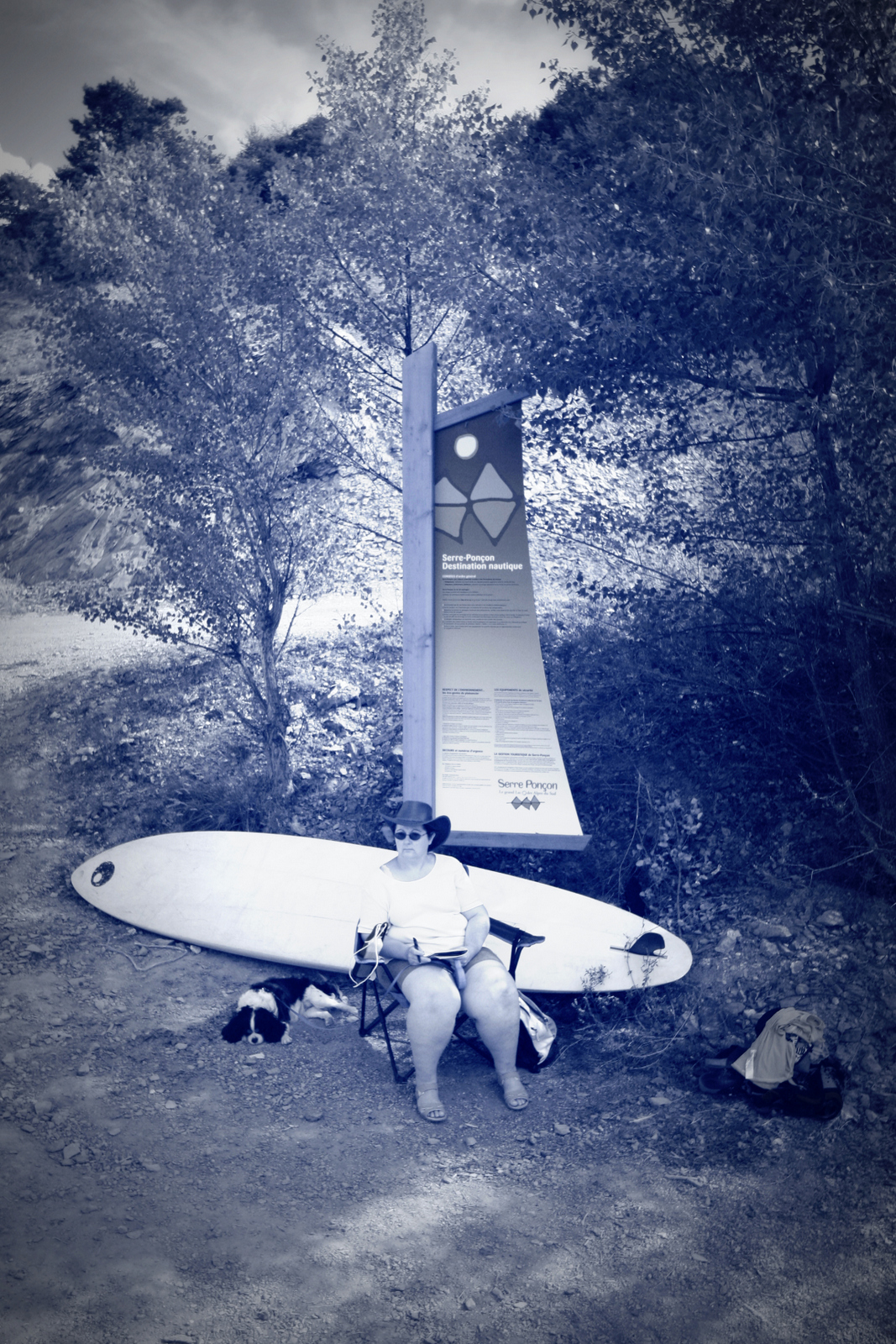 Een sportieve bink stapt uit het water en vind bij zijn surfplank een mollige gezette vrouw die met haar hondje post gevat heeft aan zijn surfplank. Dikke pech want hij had gehoopt dat er een bloedmooie vrouw had postgevat .... Verdorie dacht die man, dikke pech....