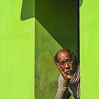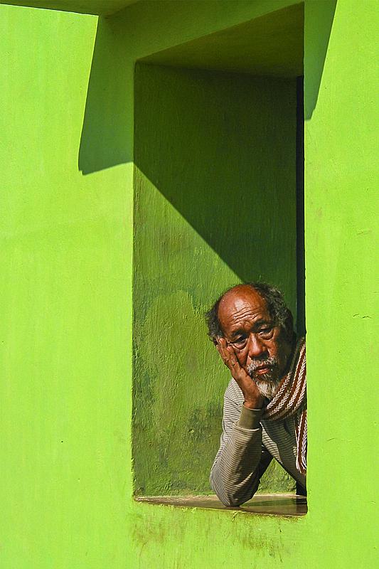 Deze man in Birma hangt peinzend uit een nis, en lijkt zich helemaal niet van mij bewust te zijn!