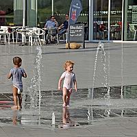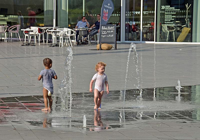 Peuters bij een straatfontein in Koblenz in Duitsland