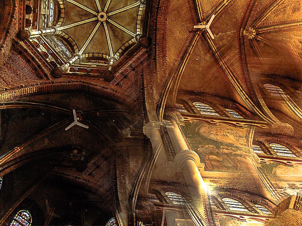 Om het plafond, dat uit verschillende kleuren bestaat en vormen, heb ik het midden opgezocht om de foto te maken. Moeilijk omdat de verlichting van de kerk niet meehielp om de foto's zo te krijgen dat de verschillende beschilderingen en glas in lood en het verhoogde diameter plafond zoals de werkelijkheid laat zien te fotograferen.