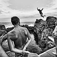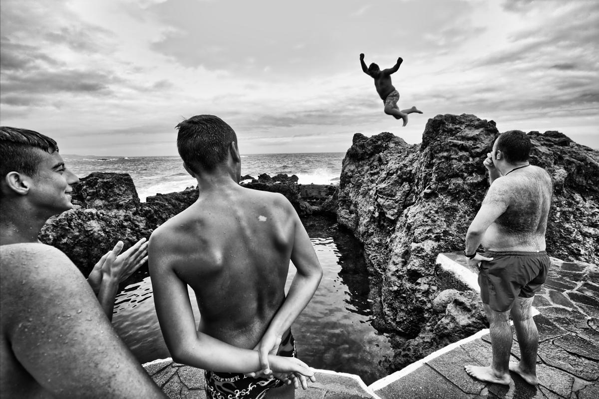 Aan de bewolkte noordzijde van Tenerife was het tamelijk fris, maar de lokale jongeren storen zich daar niet aan en houden vol overgave springwedstrijden. Juli 2012.