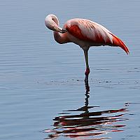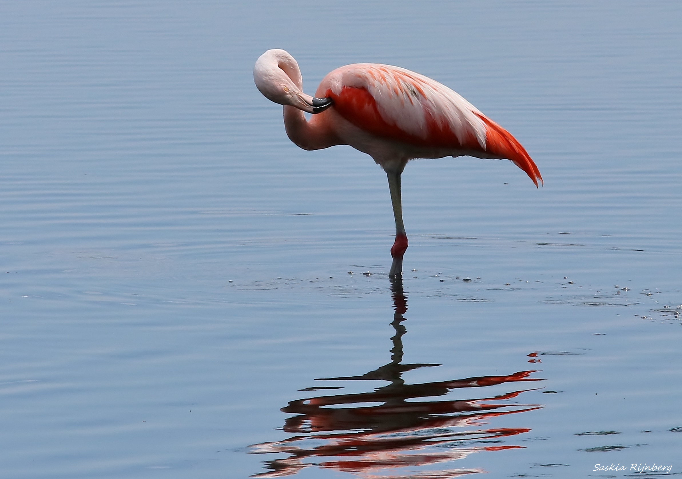 Poetsende Flamingo in het Zwilbrocker Venn in Duitsland.