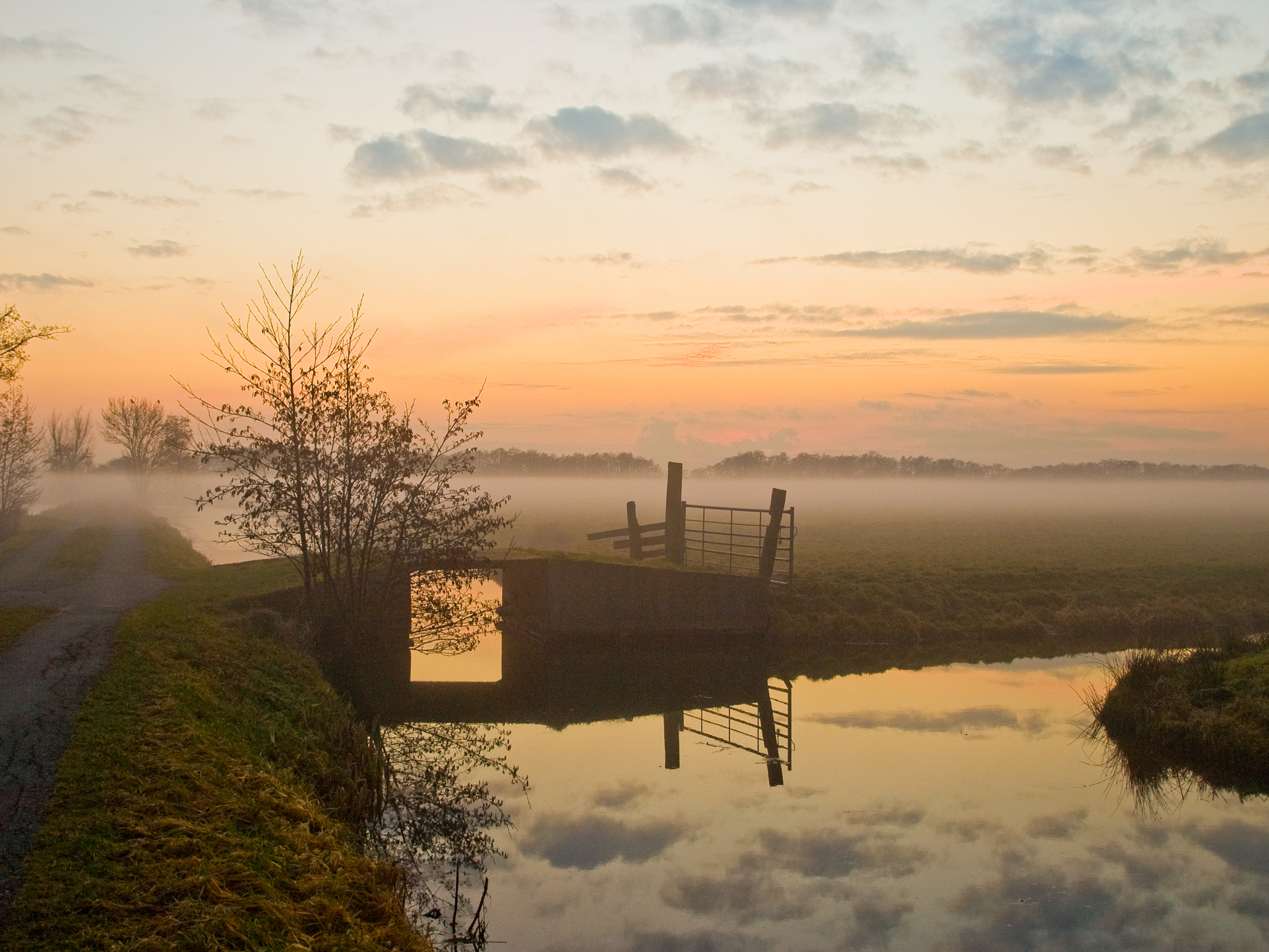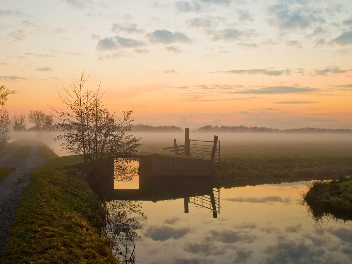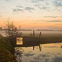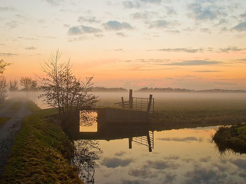 Opname gemaakt nabij Gouderak, polder Middelblok. Tijdens de zons ondergang trekken mistflarden uit de sloten om hoog.