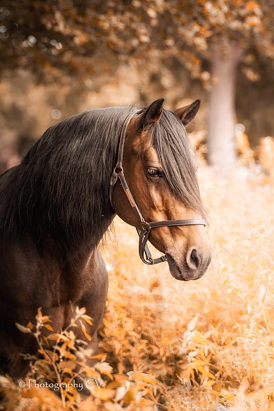 Een mooie pony van toch al 20 jaar oud, gewoon in zijn weitje op de foto