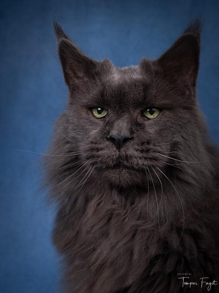 Een 12.5 jarige Maine Coon. Zijn kleur is solid blauw. Deze foto is in mijn studio genomen, Disney wil altijd wel even poseren.