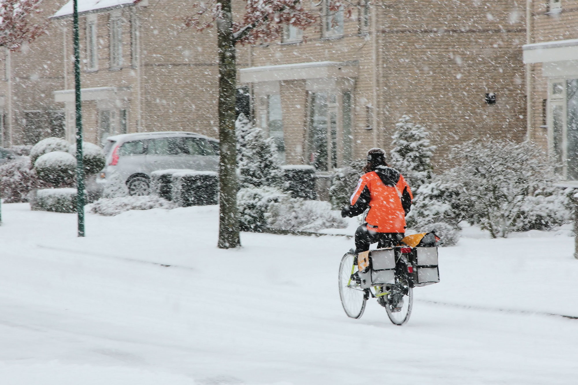 Afgelopen februari had ik plotsklaps een enorme bewondering voor alle postbezorgers van Nederland toen ik deze jongedame bij mij door de wijk zag fietsen op pad om alle post van die dag te bezorgen.