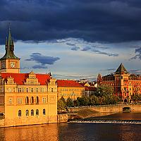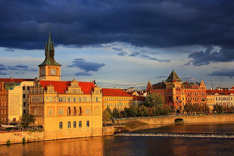 Praag tijdens zonsondergang met naderende buien.