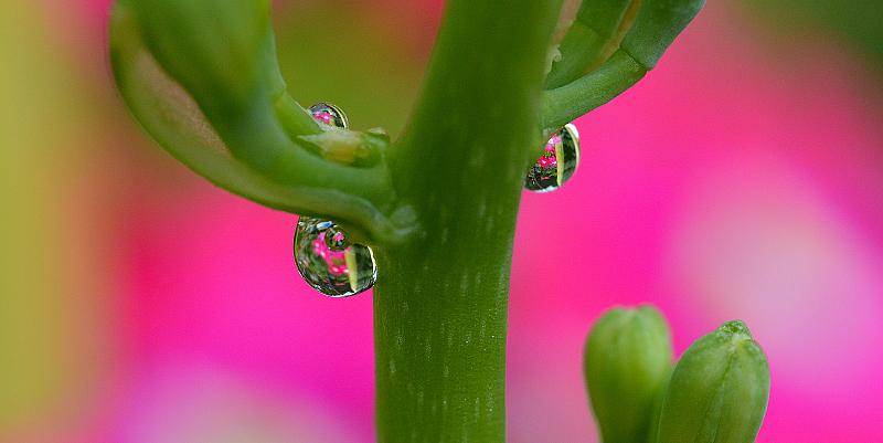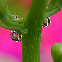 Close up van druppels gemaakt door de plant zelf en op de achtergrond een Gerbera bloem.
