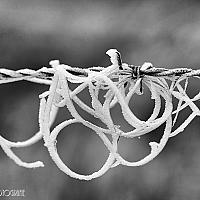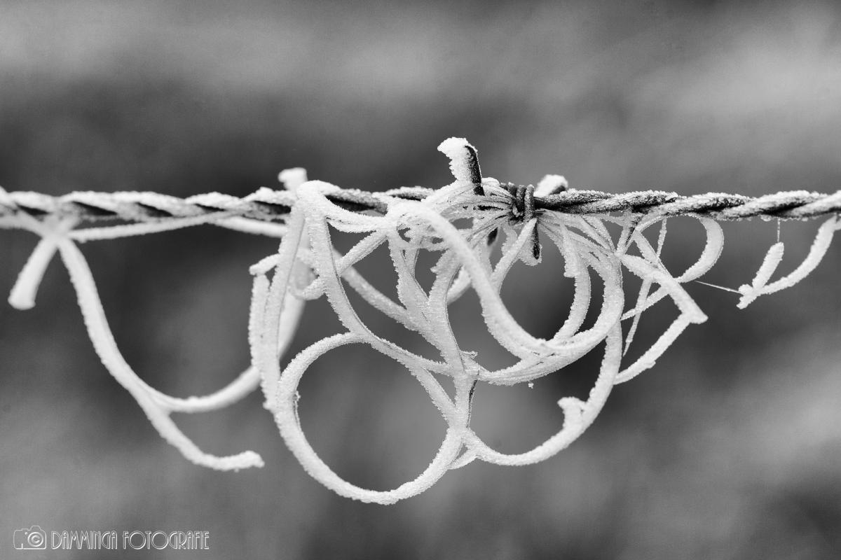 Tijdens een wandeling langs de Merwede, kwam ik dit stukje prikkeldraad tegen waar een dikke haar samen met rijp een prachtig kunstwerkje hebben gemaakt.