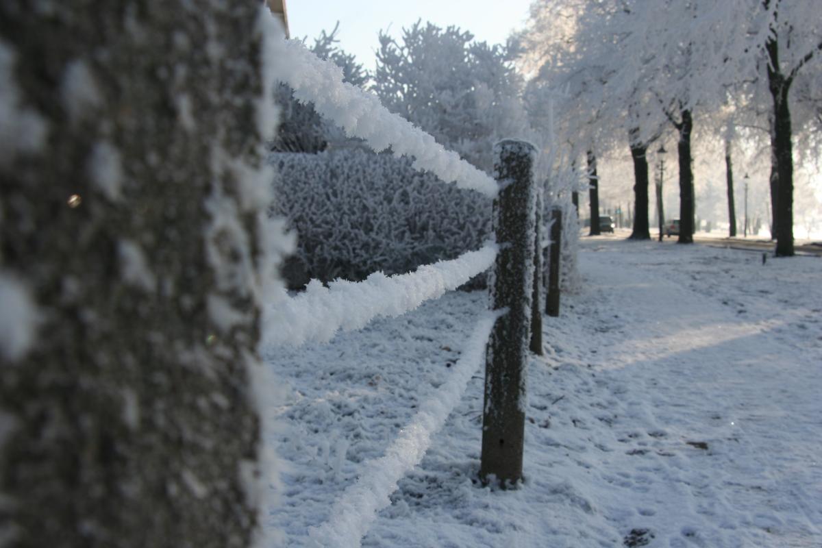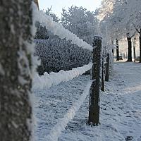 Mooi hoe de sneeuw op het prikkeldraad blijft hangen.