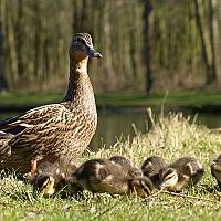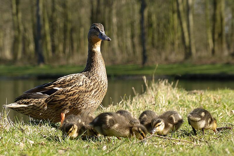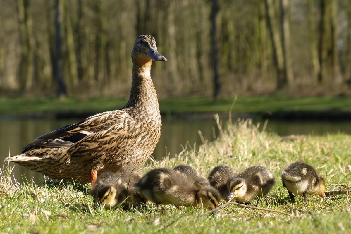 Terwijl moeder eend op de uitkijk staat eten haar kuikens hun buikjes rond.