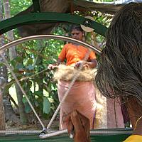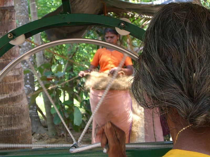 De vrouw rechts in beeld draait aan een wiel om het zojuist gesponnen kokostouw (door de 2 vrouwen op de achtergrond) op te winden.