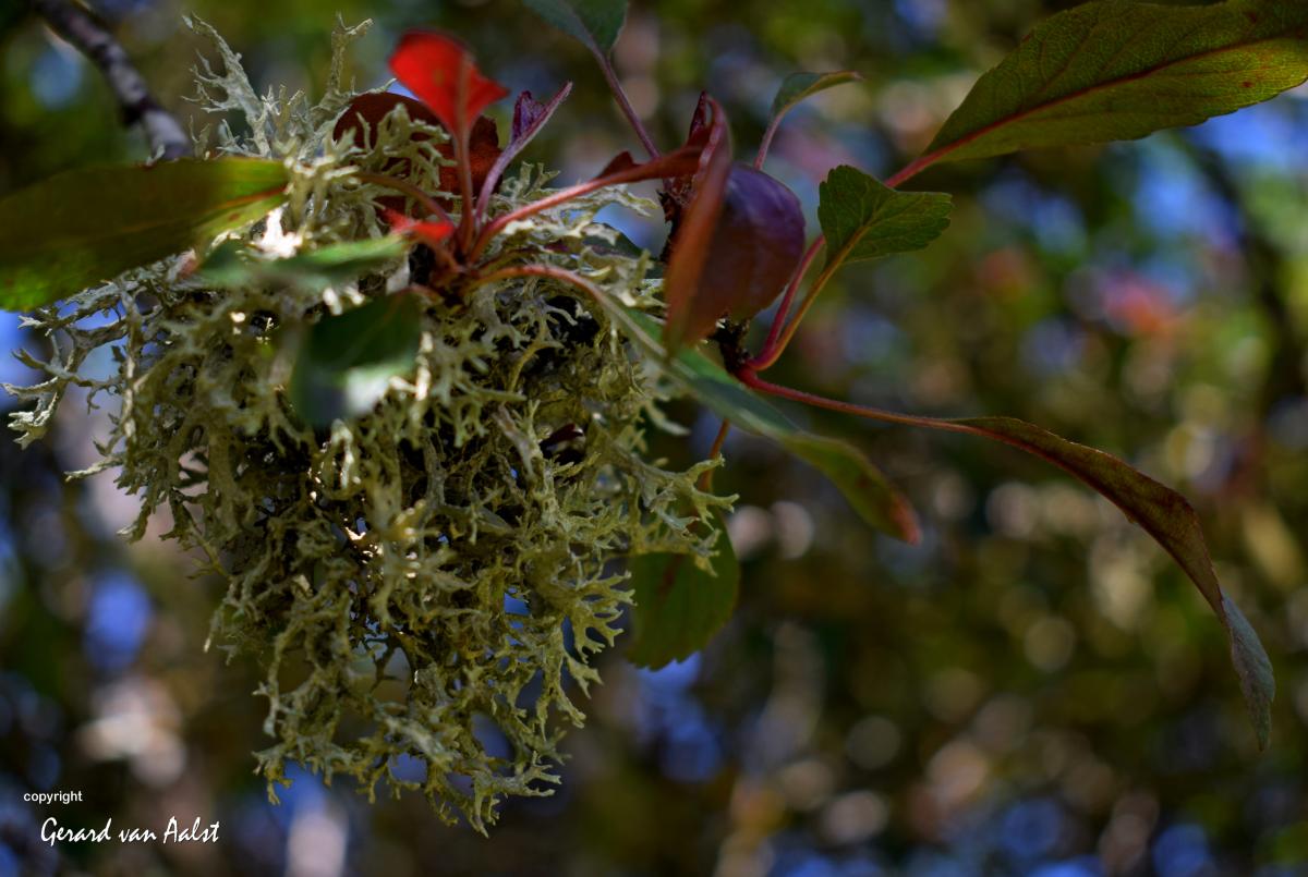 purpergewei-mos in een appelboom