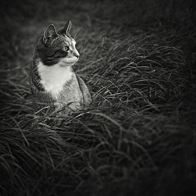 In het weiland, hoog gras, wachtend... tot ze een muisje hoort lopen. Dagelijks vangt ze er meerdere. Hoe heerlijk onverstoorbaar kan een katten-leven zijn.