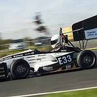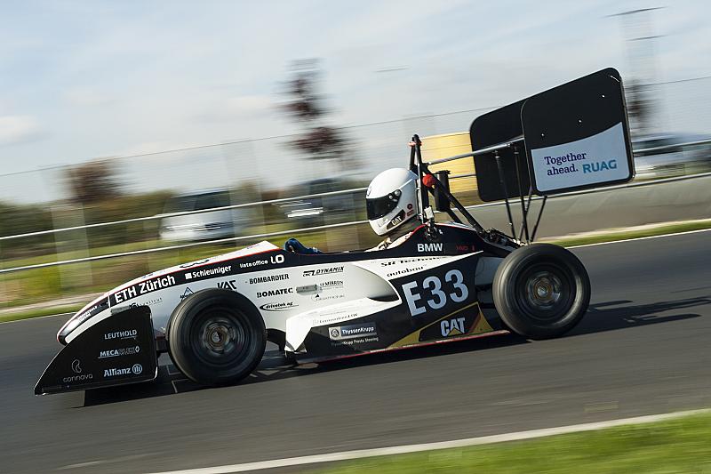 Een van de Formula Student auto's van de Universiteit van Zurich racet over een kartbaan in Tsjechië tijdens een competitie. Door het pannen is de snelheid van de auto goed te zien.