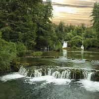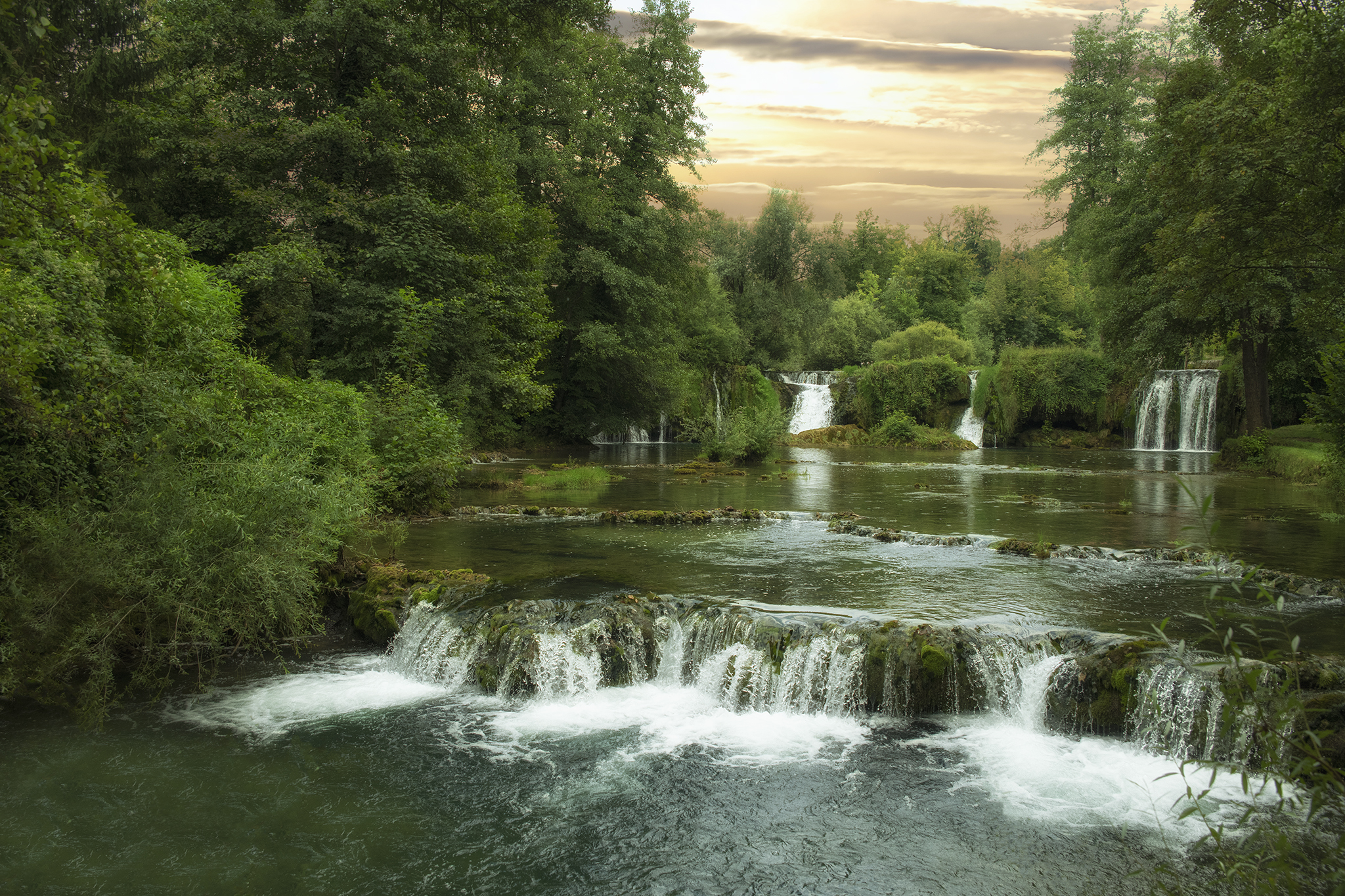Vele kleine watervalletjes, in het zachte avondlicht.