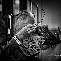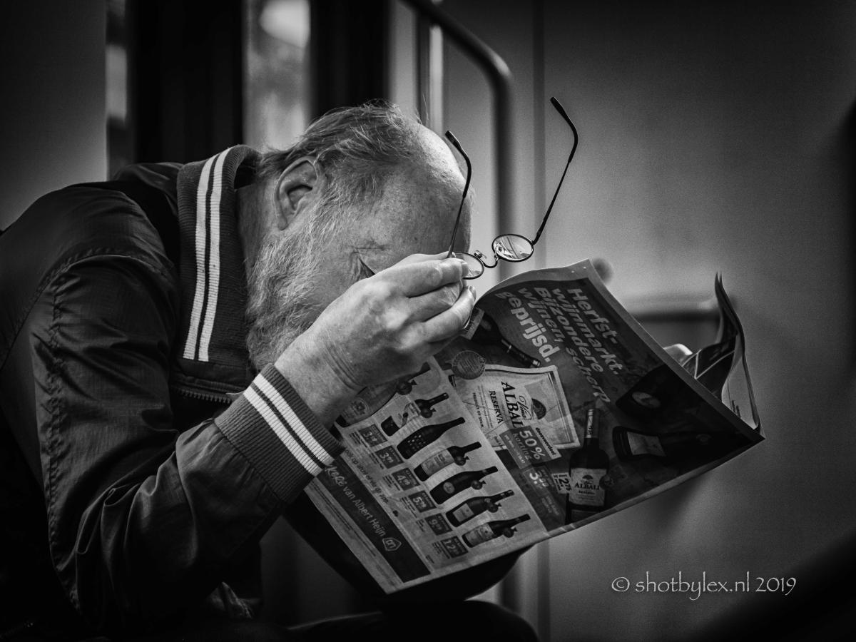 In de trein, zijn bril ging af, zijn neus diep in de krant. Zelfs de kleinste lettertjes werden gelezen...