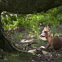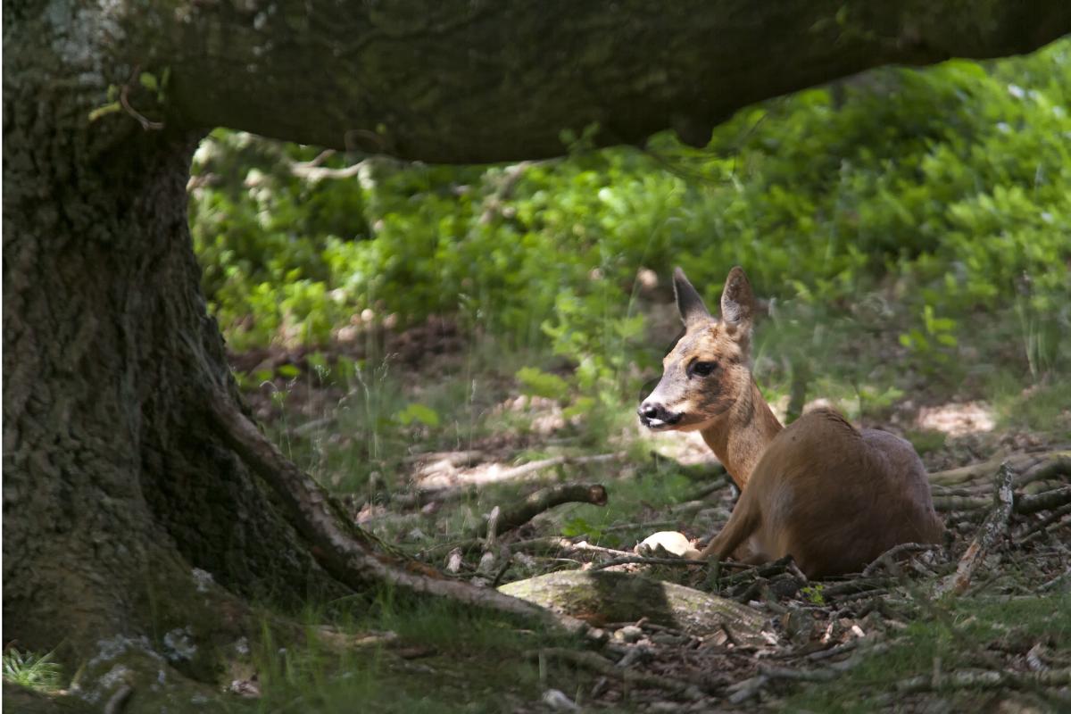 Een ree rust overdag onder een boom op het Herikhuizerveld, Veluwe.