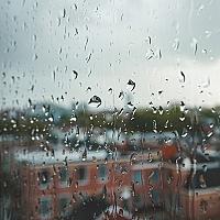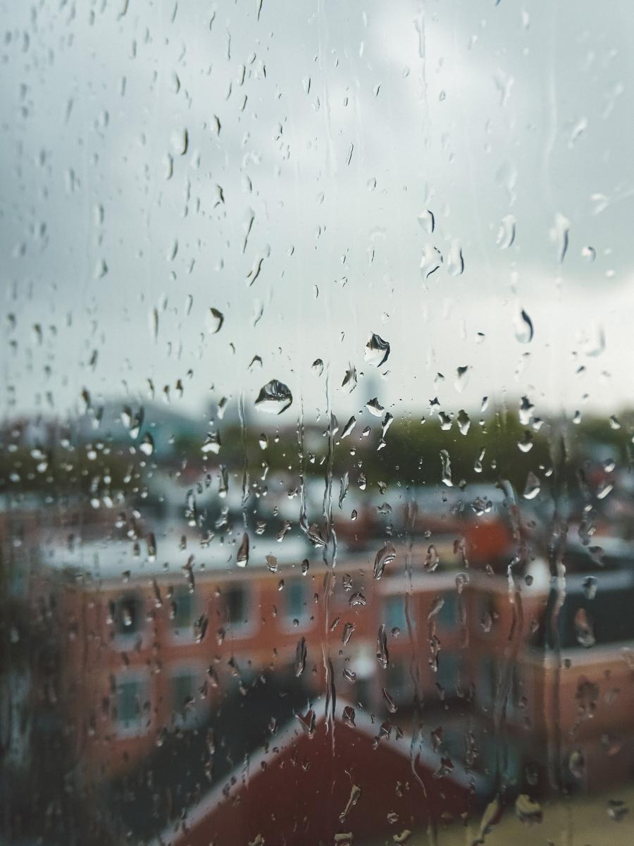 Regendruppels gefotografeerd op een raam in het UMCG met op de achtergrond het centrum van Groningen.