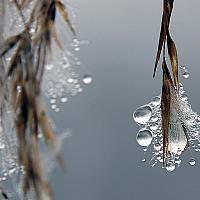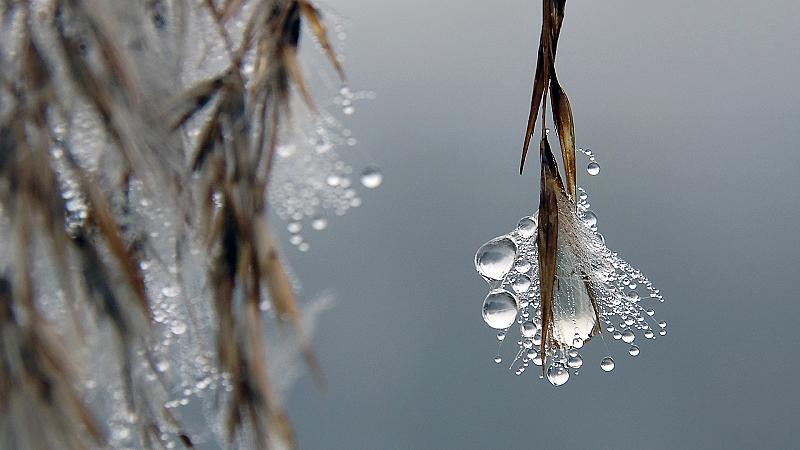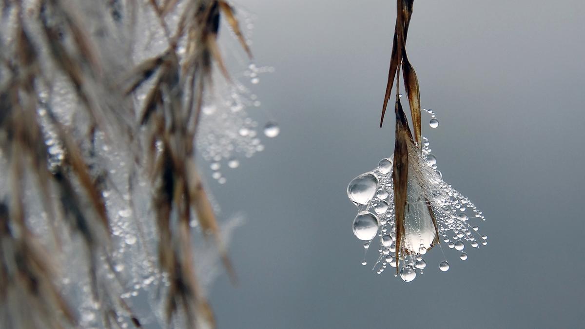 Op een mistige lentemorgen had het riet wat water verzameld.