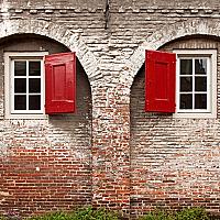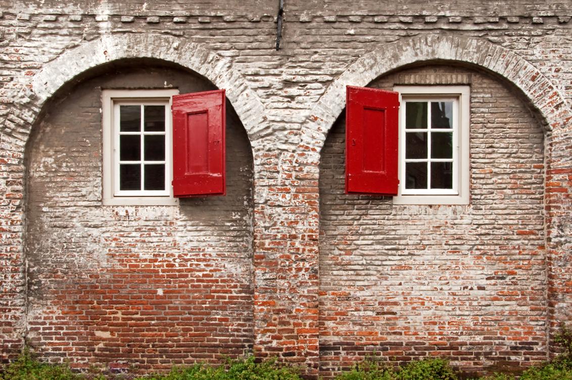 De koppelpoort heeft een verweerde schoonheid en de rode luiken van de ramen geven een mooi accent.