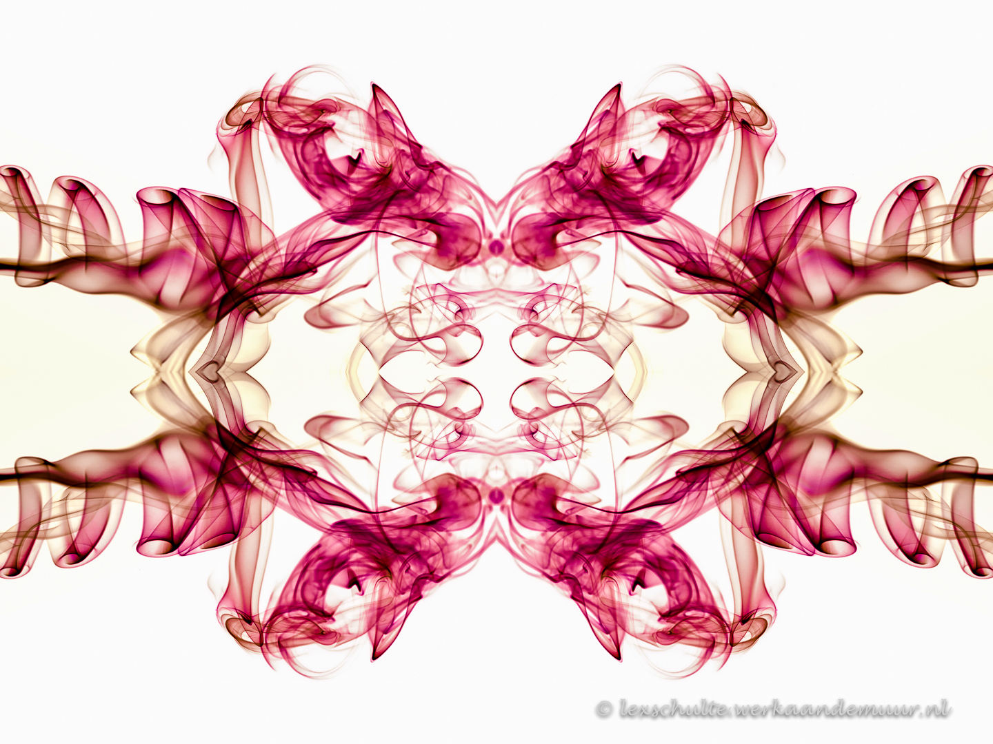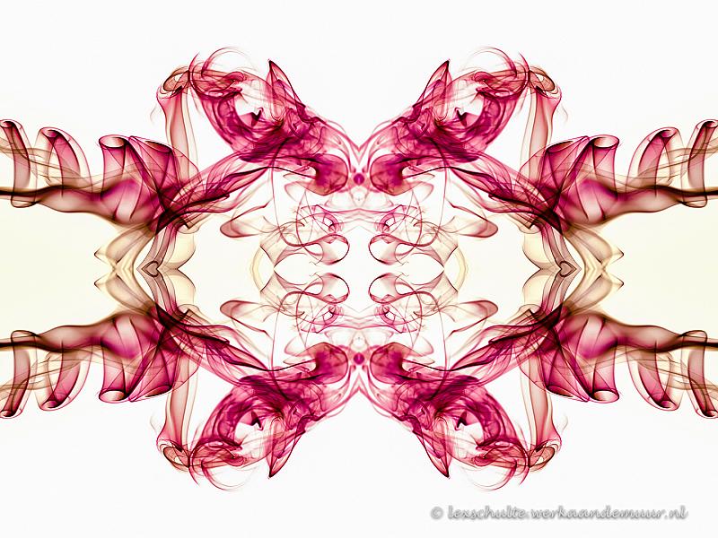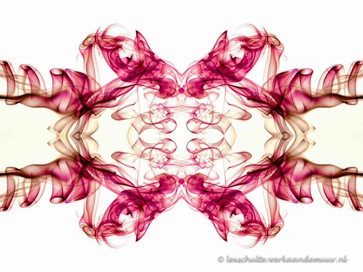 De foto is in lightroom nabewerkt en omgezet naar negatief. Daarna is de foto een aantal malen gespiegeld en tegen elkaar gezet om deze symmetrie te verkrijgen. ZO lijkt het op een Rorschach vlek.