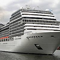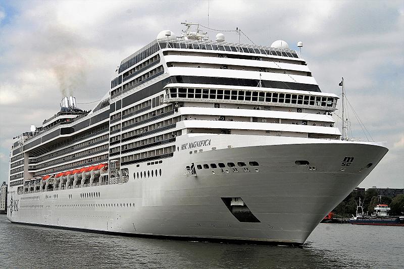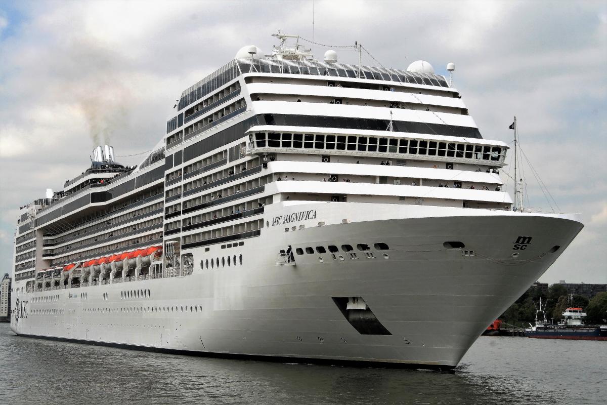 De MSC Magnificia tijdens het afmeren aan de Cruiseterminal in Rotterdam.