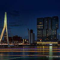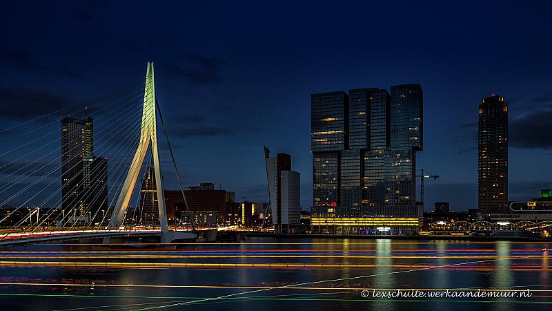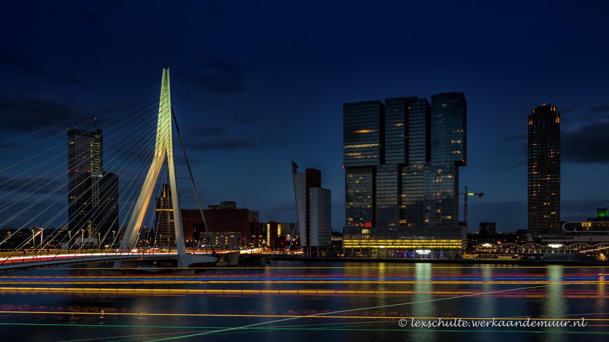 Spitsuur op de Maas voor de kop van Zuid in Rotterdam. Door gebruik te maken van een heel lange sluitertijd kreeg ik de verschillende kleuren van de verlichting van de bootjes mooi als sporen in de voorgrond.