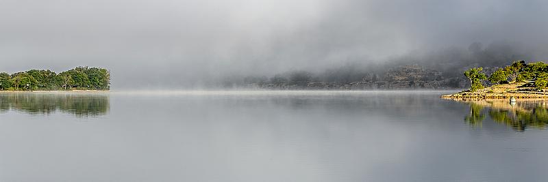 S-morgens in alle vroegte naar het meer. Het was stil. Wat een prachtige geheimzinnige sfeer met die laaghangende bewolking en mist. Zo sereen dat je bijna vergeet je camera uit de fototas te halen