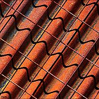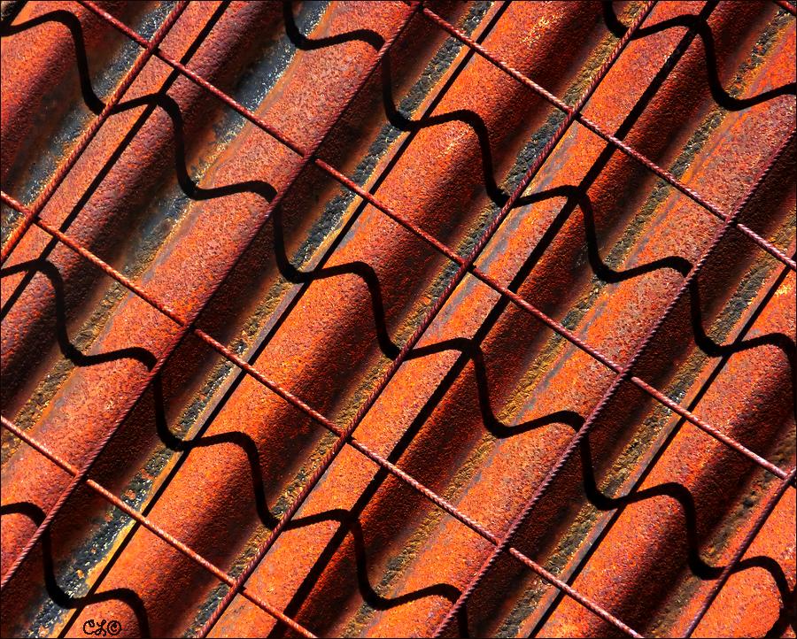 Geroeste golfplaten met daarvoor draad-staal waardoor bijzondere schaduwen ontstaan. Een foto gemaakt op een bouwterrein.
