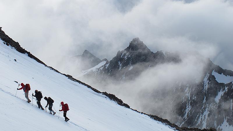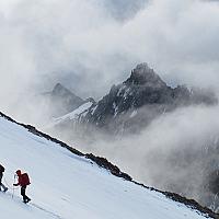 Een touwgroep beklimt de Weissmies op een bewolkte morgen. Later klaarde het helemaal op.
