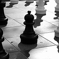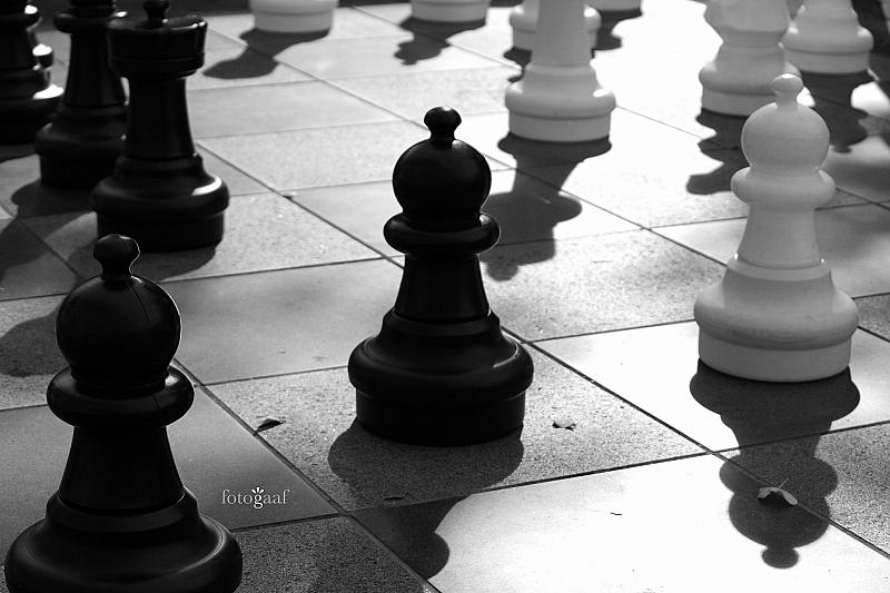 Een reuzen schaakbord buiten op het plein naast de bibliotheek, de laagstaande zon werpt mooie lange schaduwen over de schaakstukken. Wie staat er als eerste schaakmat?