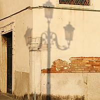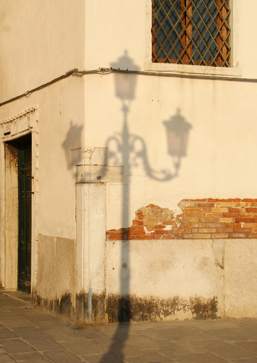 De typische straatverlichting van Venetië in beeld gebracht door de eigen schaduw, hoewel het onderwerp niet in beeld gebracht is, is het toch aanwezig.