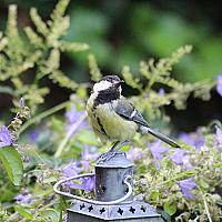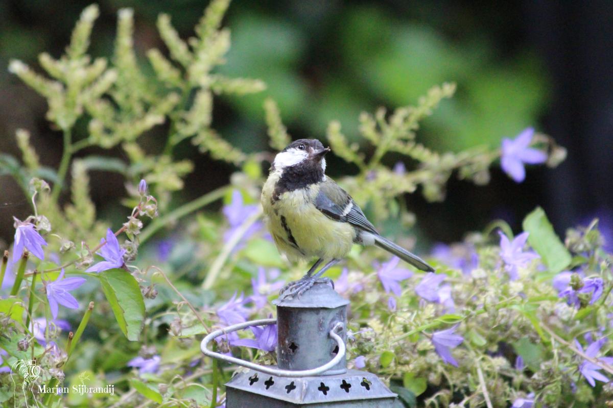 Zo schattig dat koolmeesje op de lantaarn tussen de bloemen. M Stand