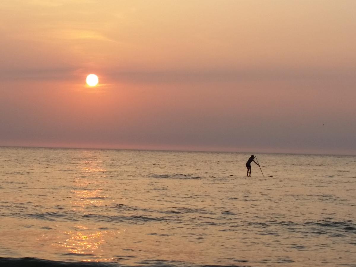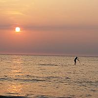 Prachtig hoe het licht op de zee valt en er voor zorgt dat de persoon op de plank zwart uit komt!