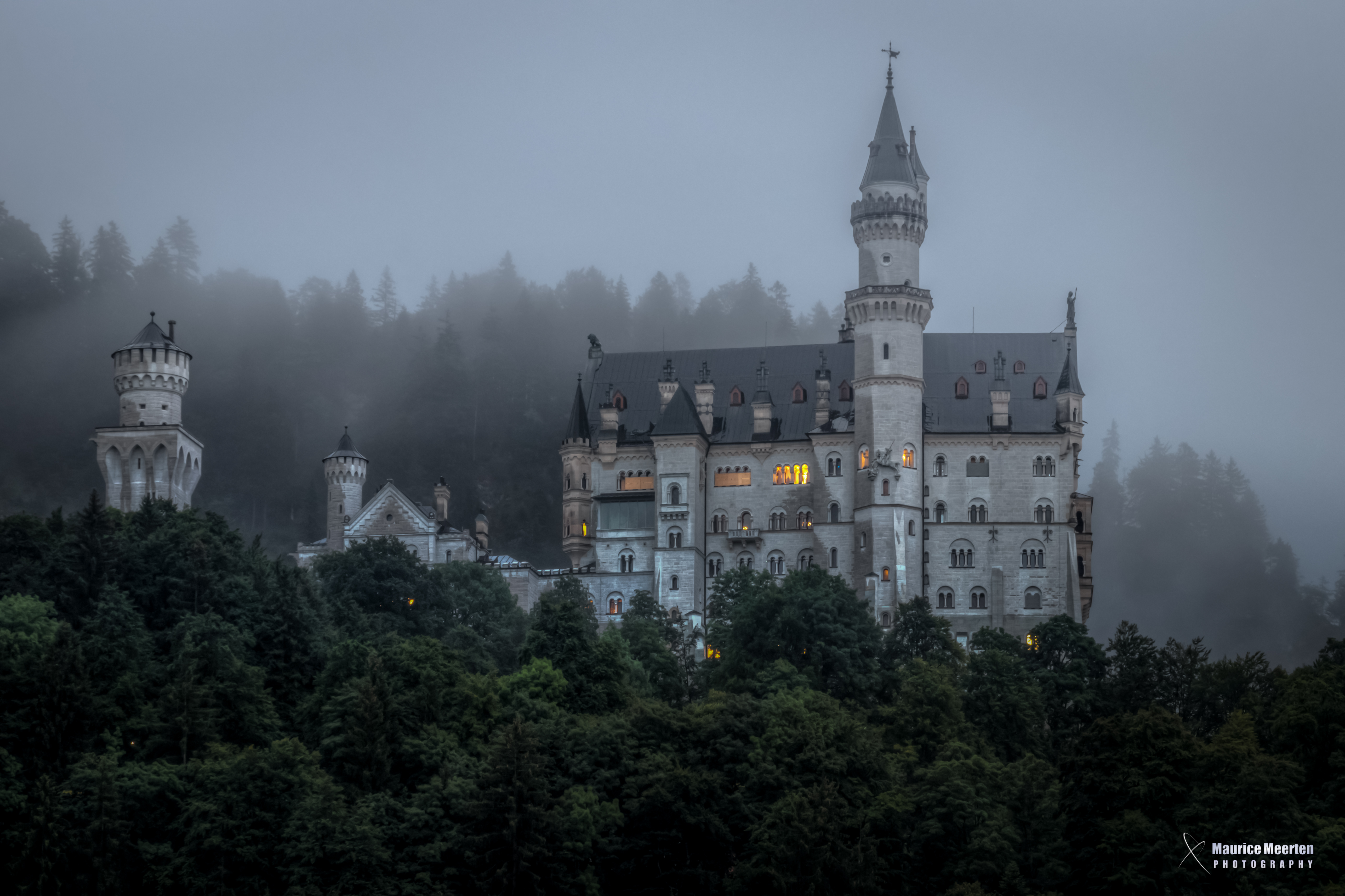 Slot Neuschwanstein om 5 uur 's morgens in de stromende regen..... We kwamen hier langs op weg naar ons vakantie adres en ik wilde absoluut een foto van het kasteel maken.... Maar ja, de regen kwam met bakken uit de hemel, dus met paraplu, statief, lensdoekje (om de druppels van de lens te vegen) uit de auto gestapt en deze geschoten.... Heel erg blij mee, want in daglicht zou deze toch minder sfeer hebben gehad.... 10 minuten later (toen ik nog een foto wilde maken vanuit een ander standpunt) was het kasteel overigens volledig verdwenen in de mist....
