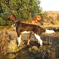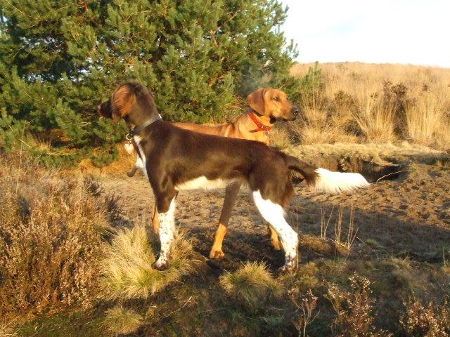 Mijn hond met daarachter een hond van iemand anders die wel een schutkleur lijkt te hebben.
